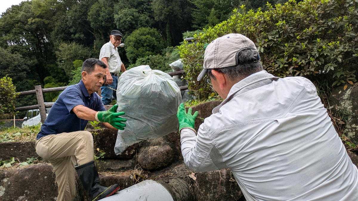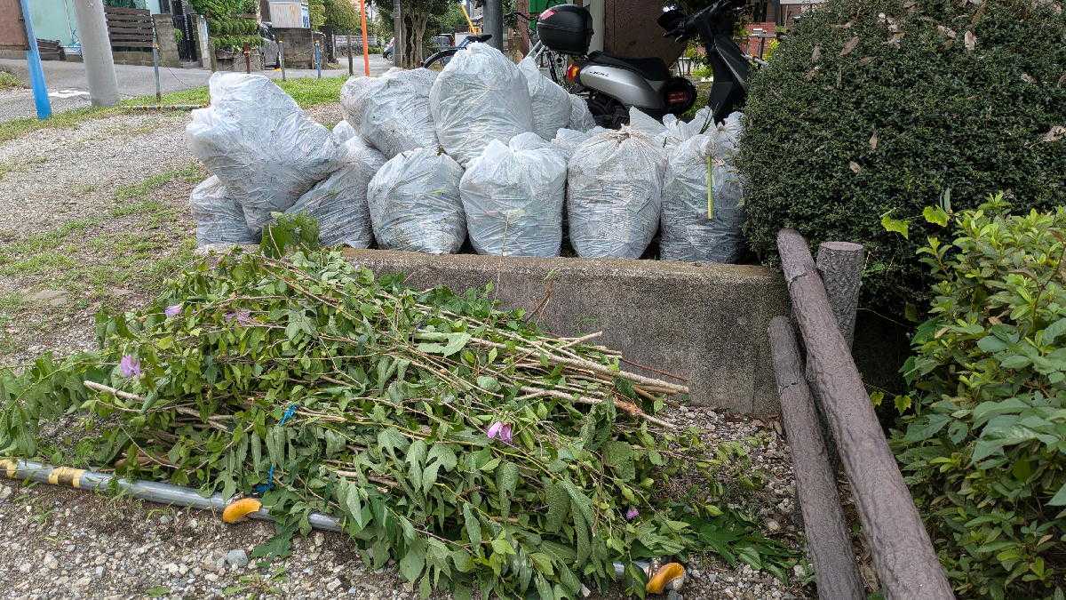 今日の収穫量45L袋 24袋・剪定樹木ひも掛け木多量、作業参加者は8名でした。