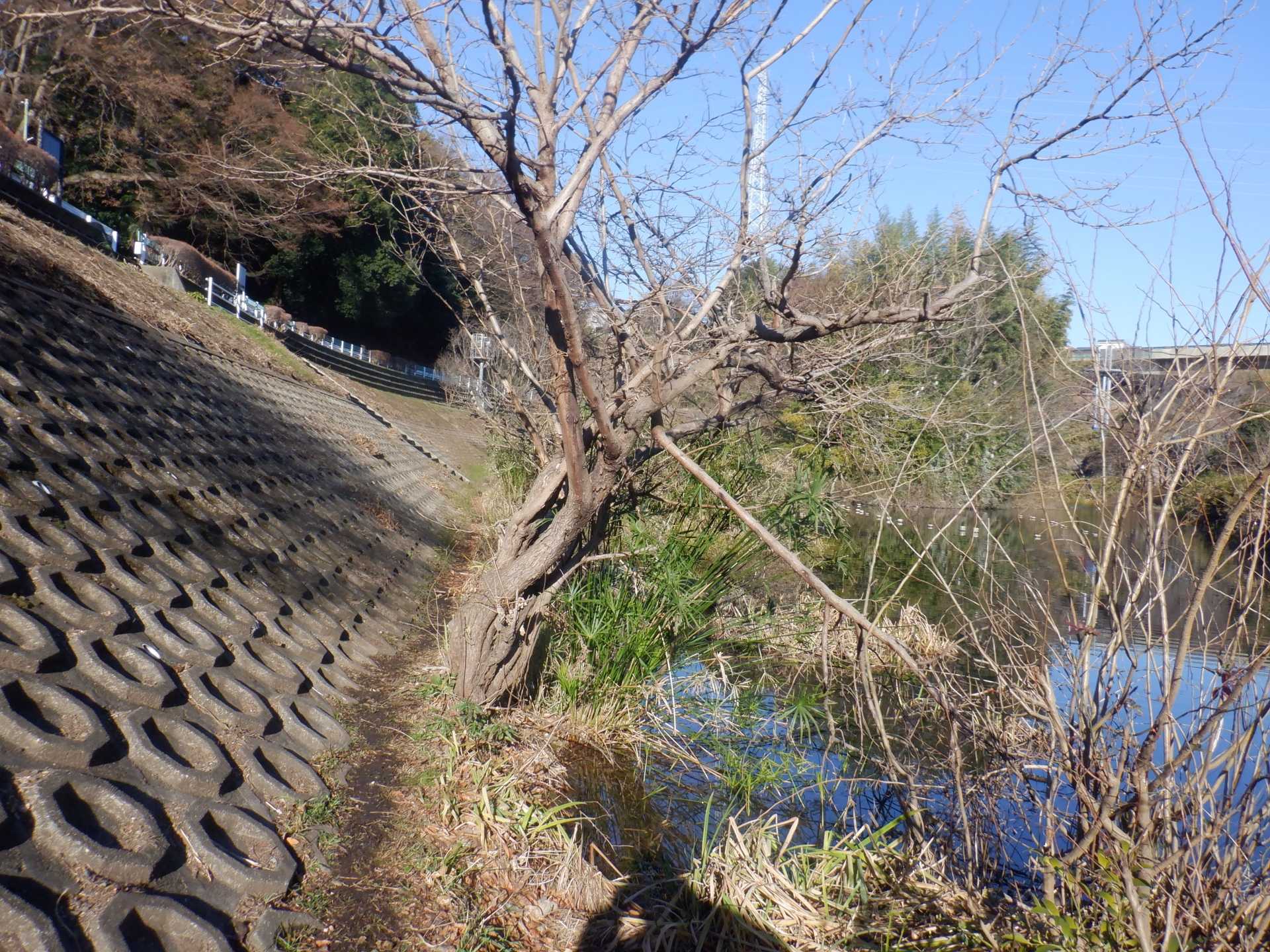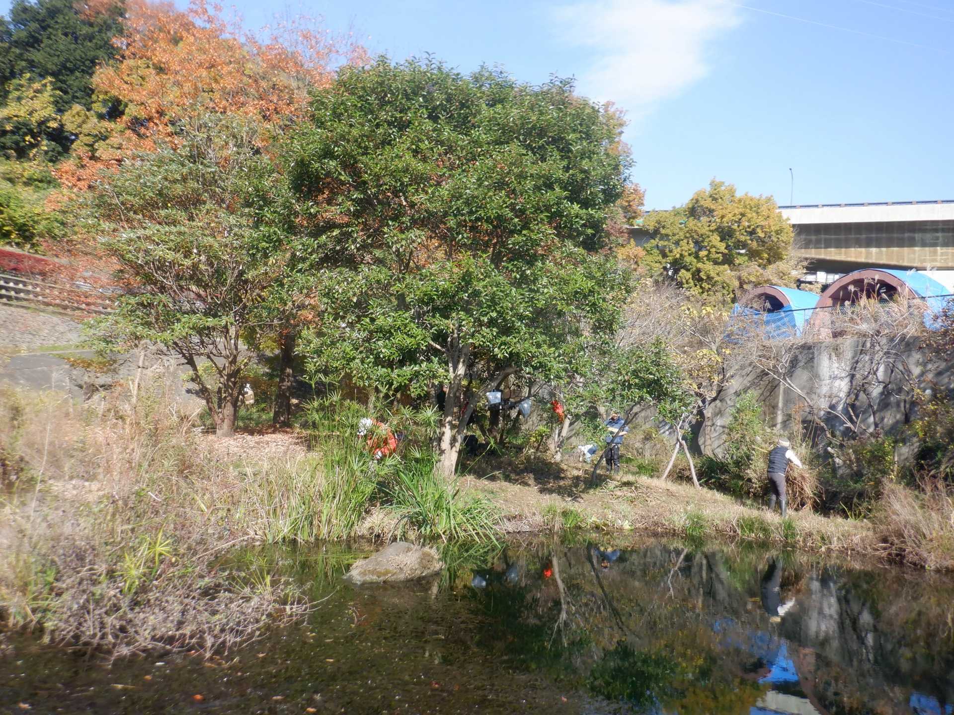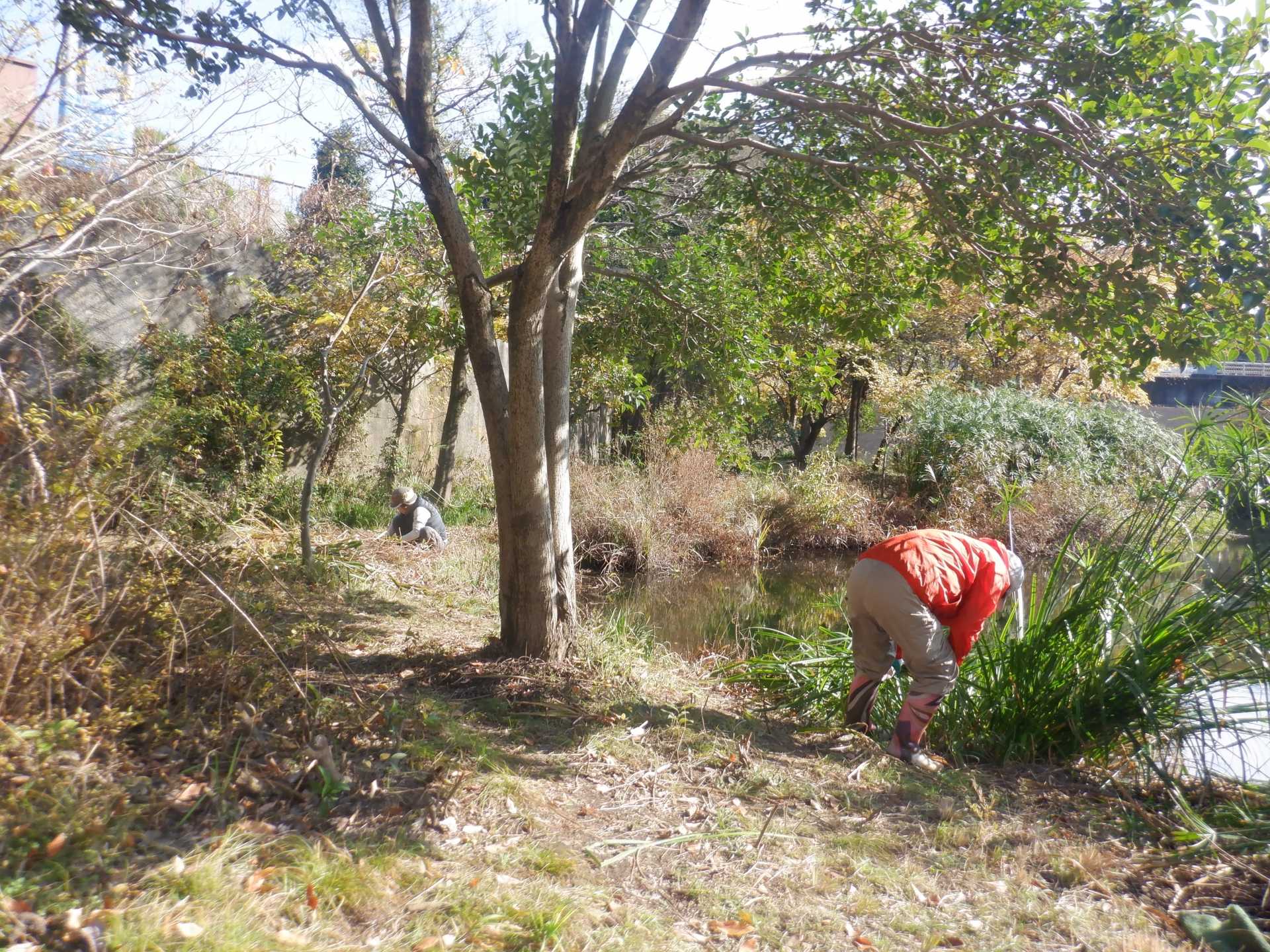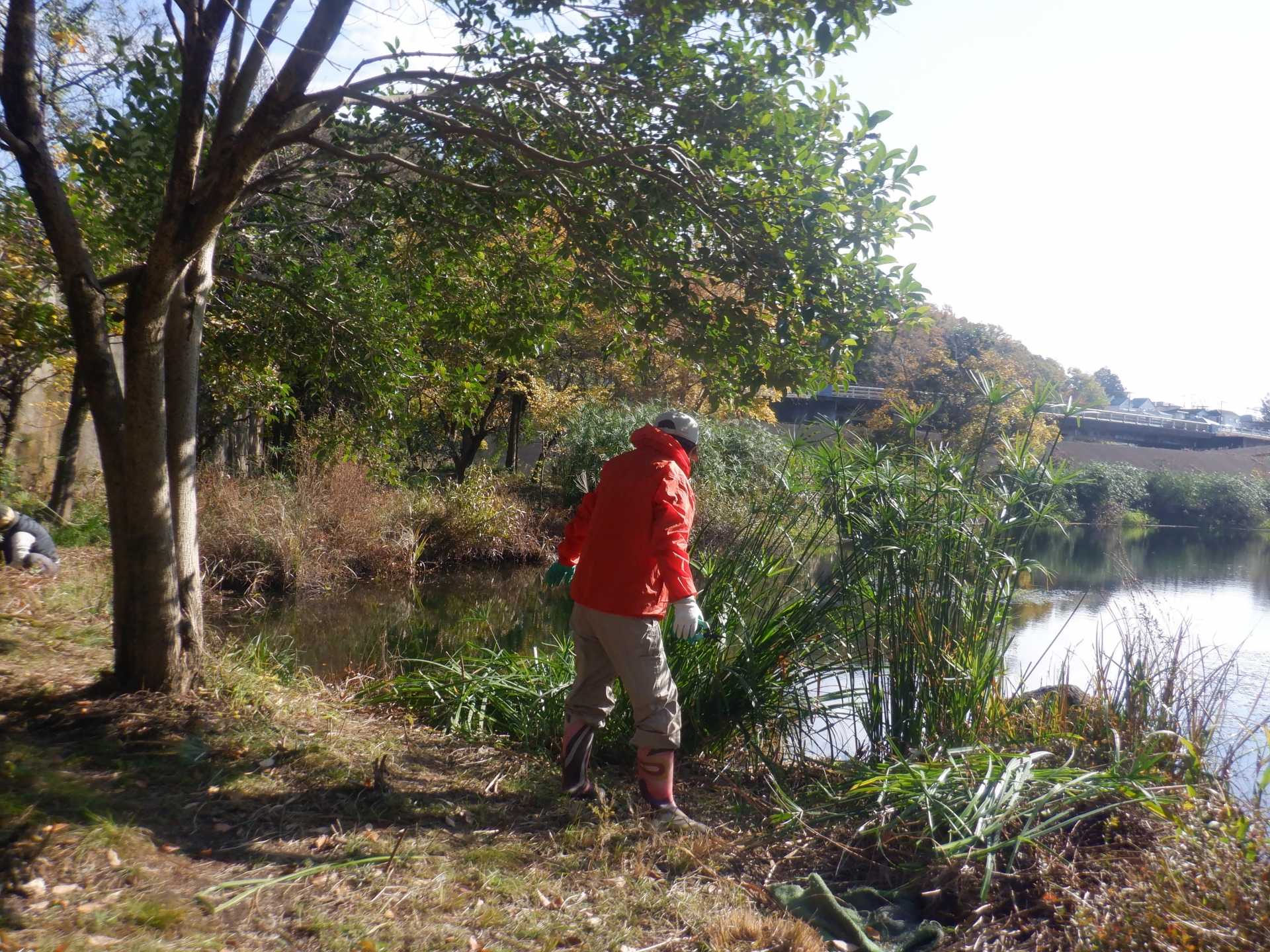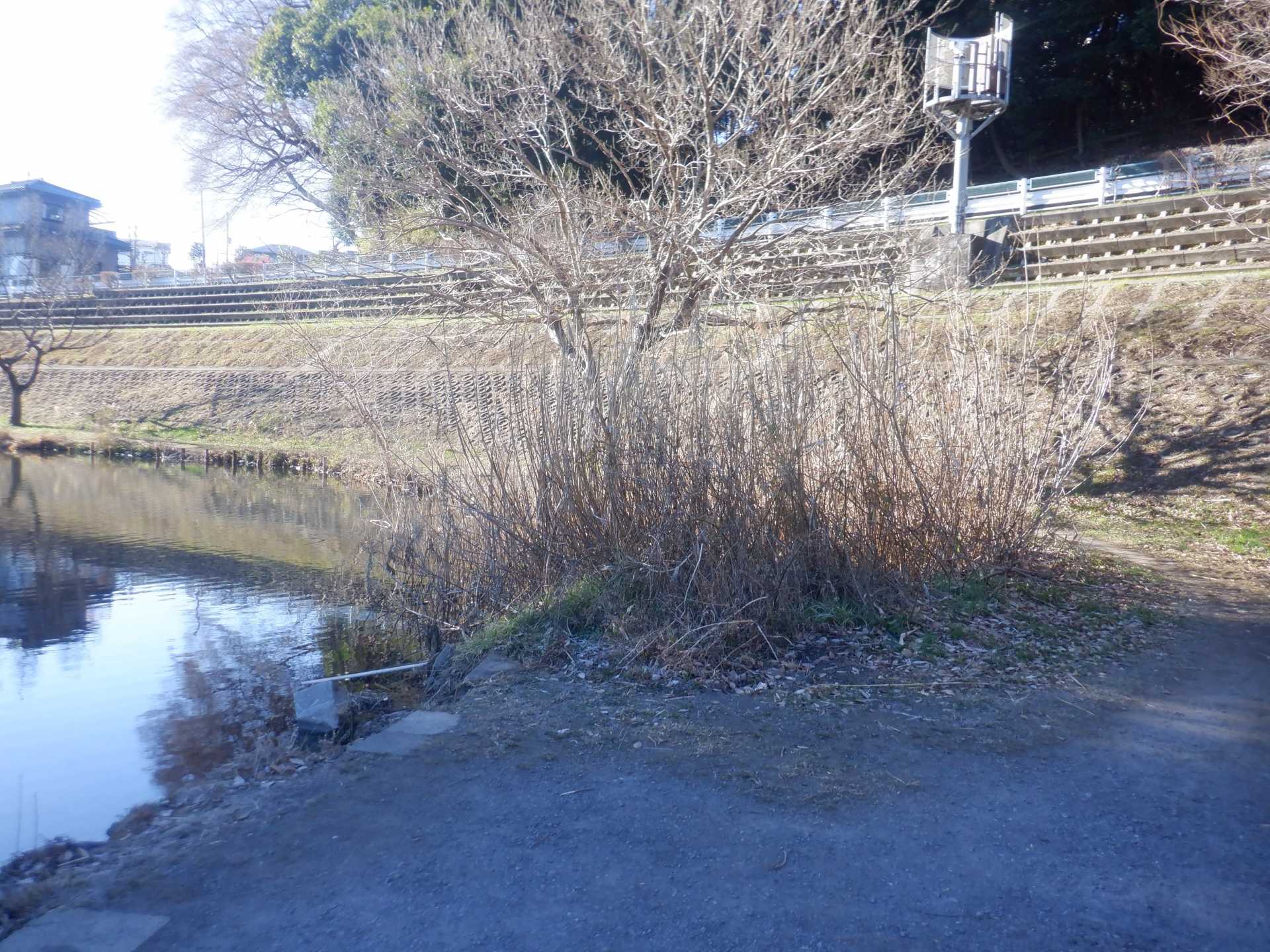 今日の作業は、水路対岸にあるクロガネモチ6本とエノキの伐採です。エノキは問