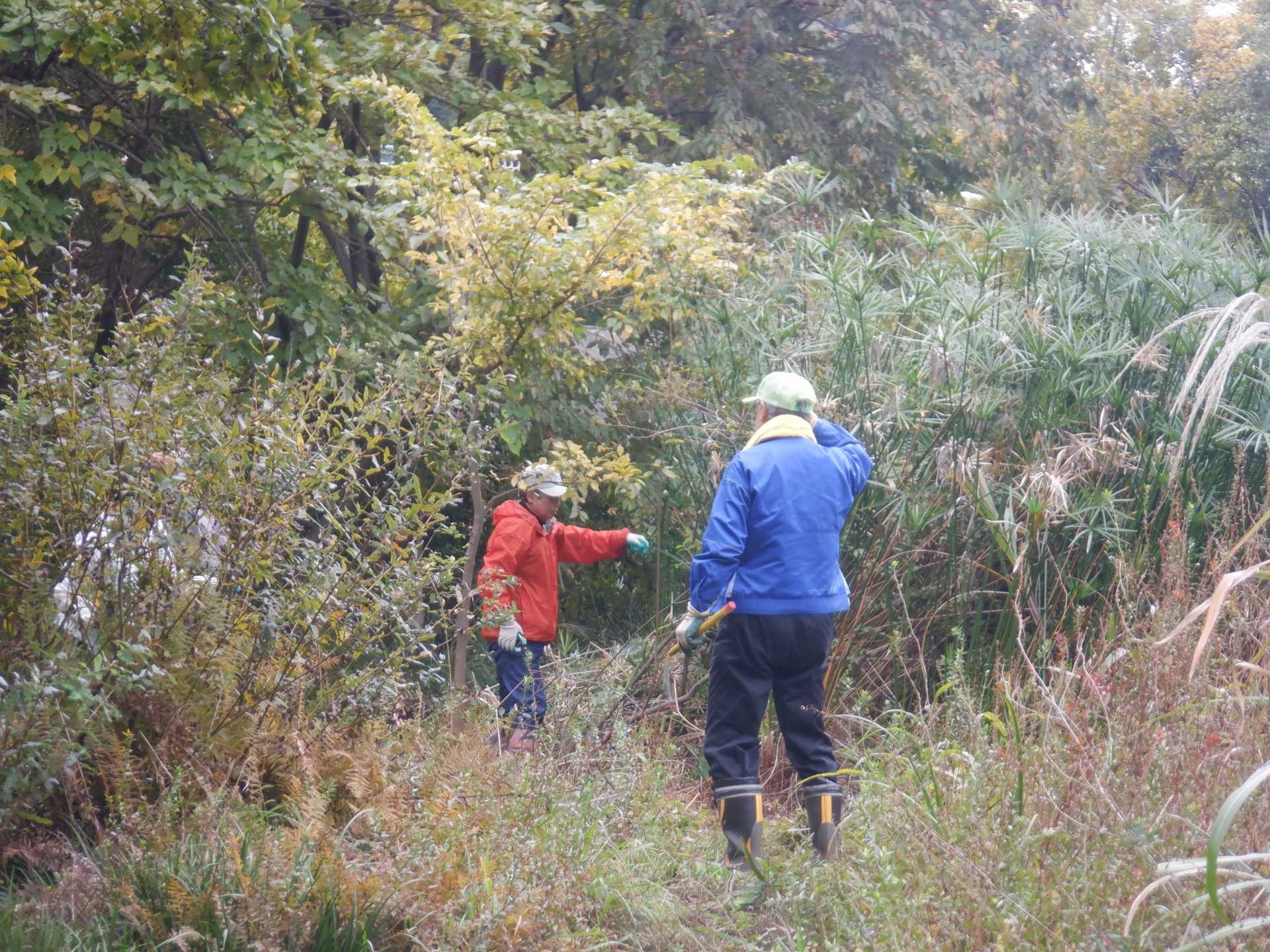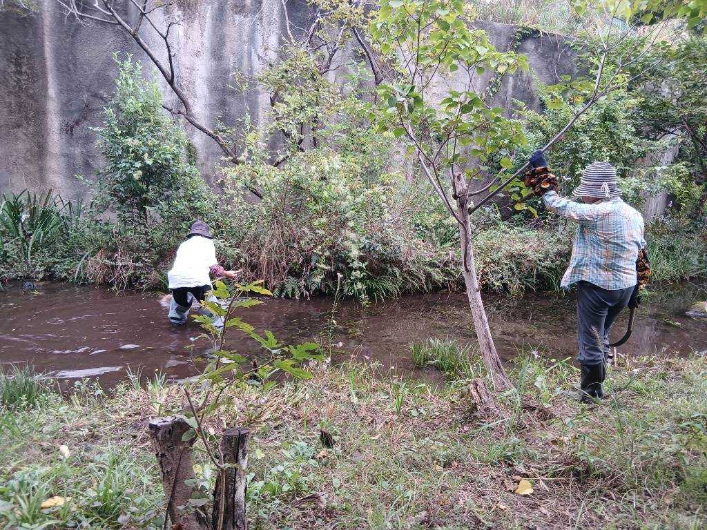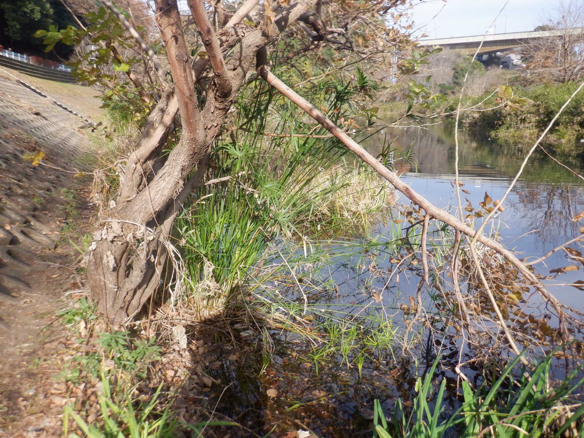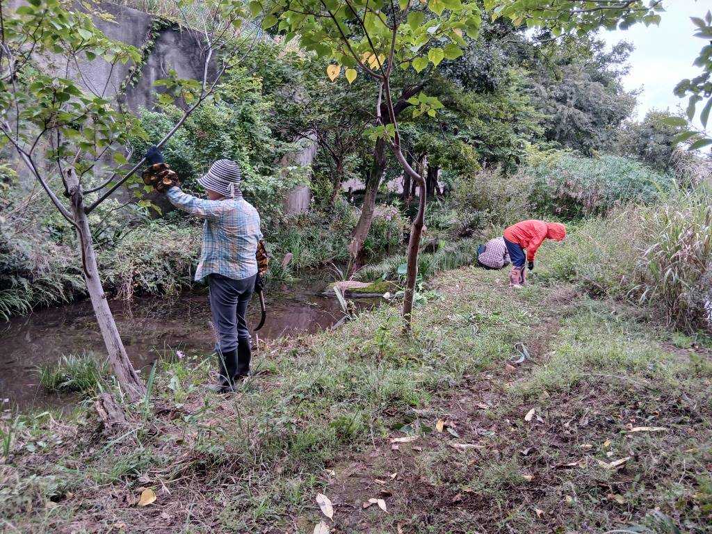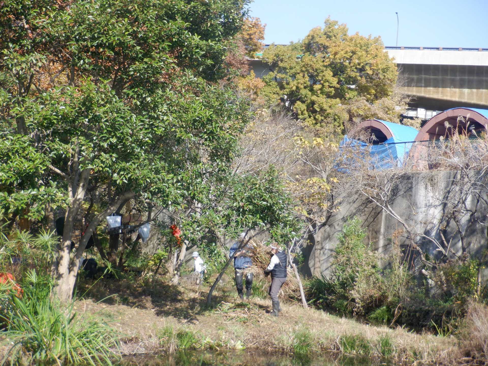 今日の作業は、水路対岸にあるクロガネモチ6本とエノキの伐採です。エノキは問