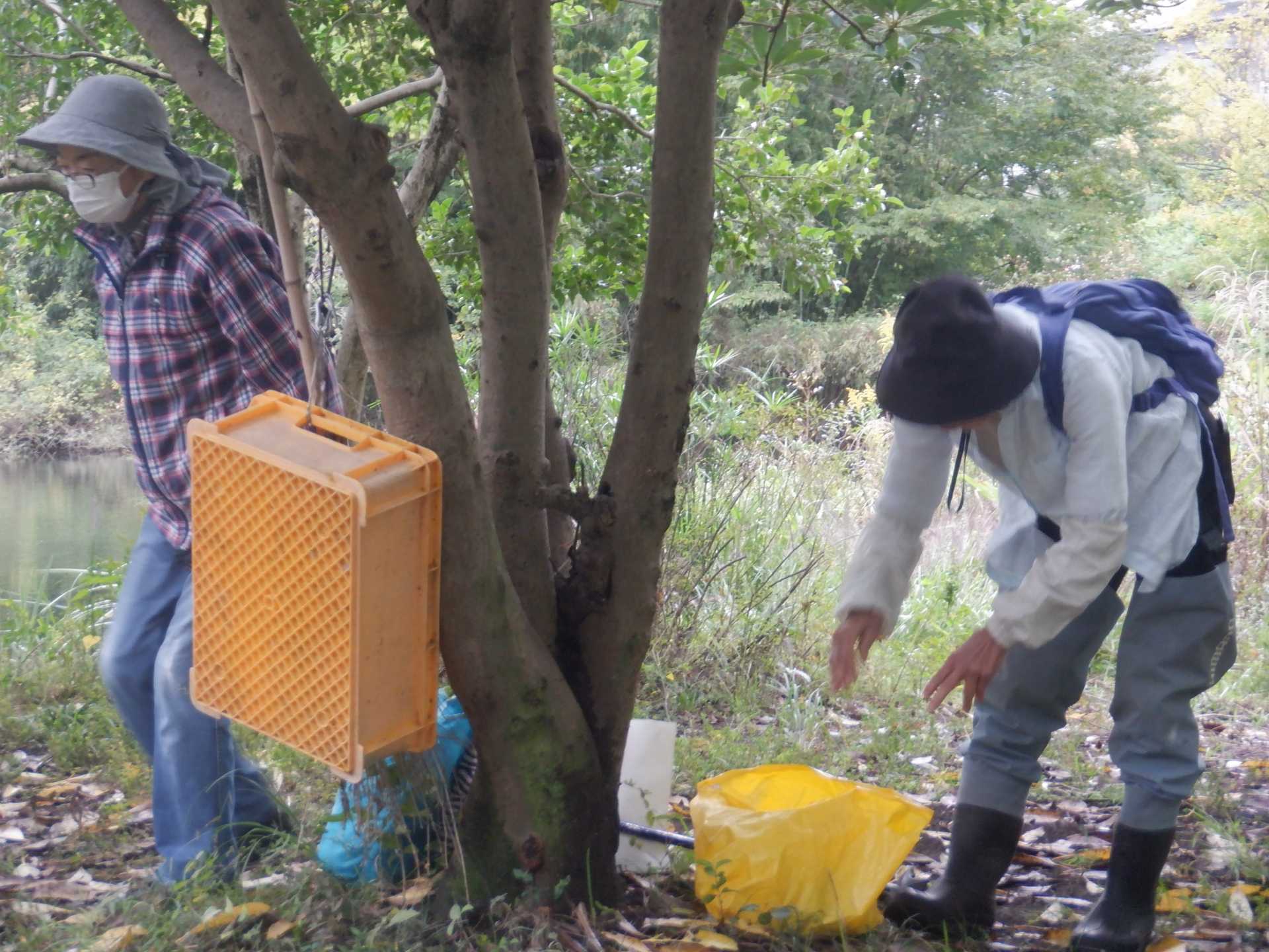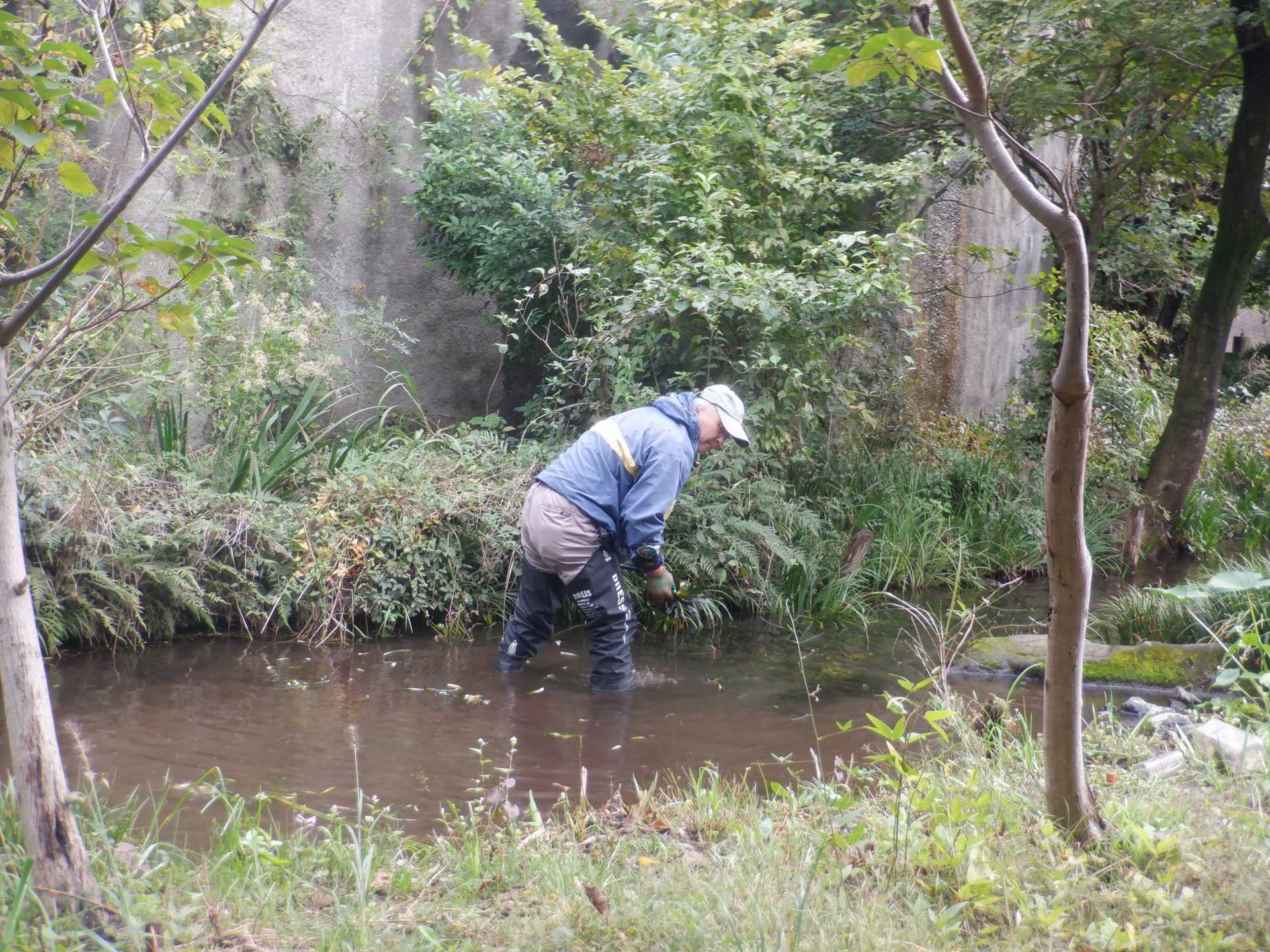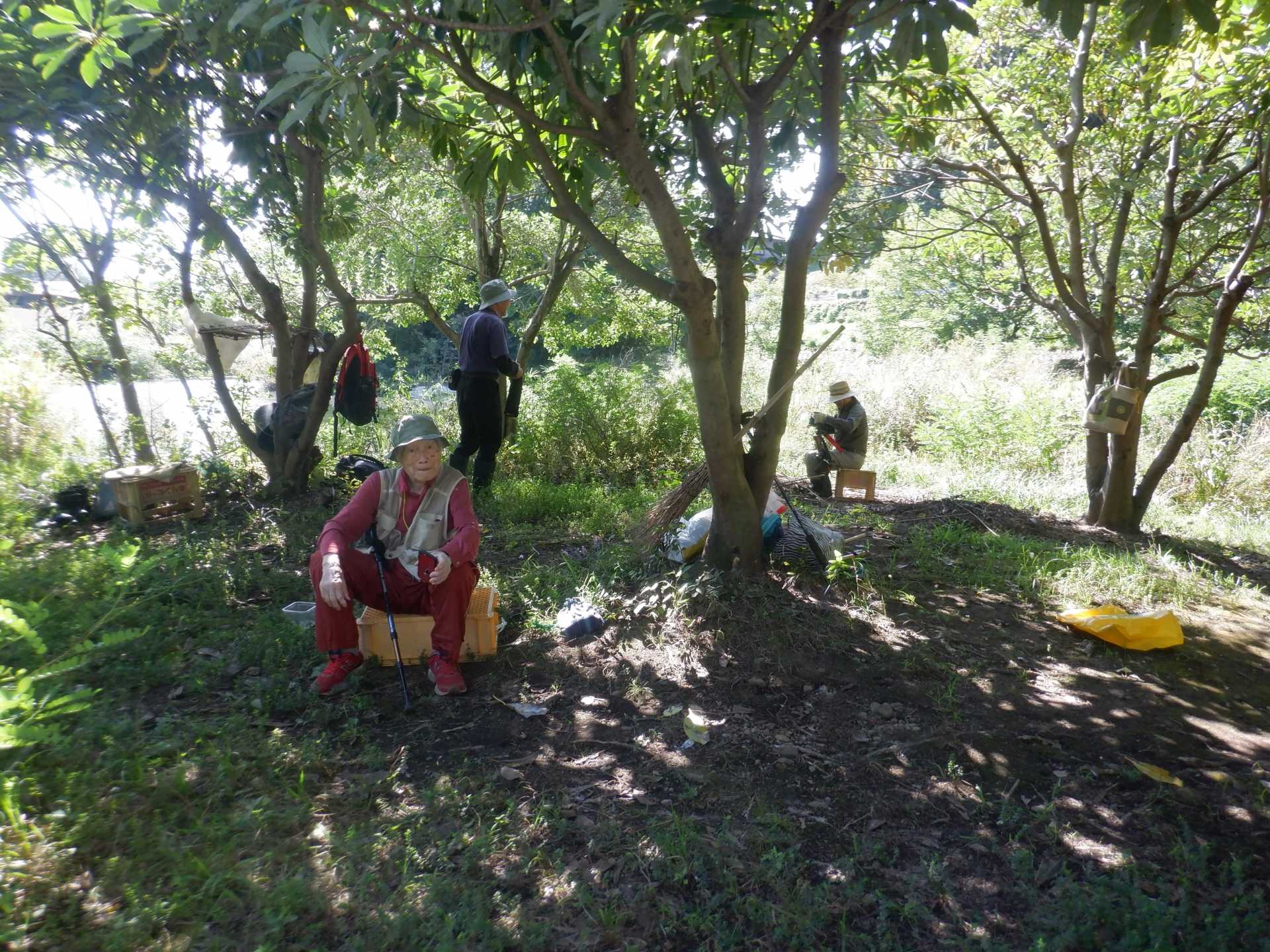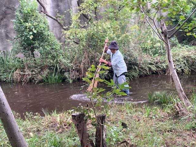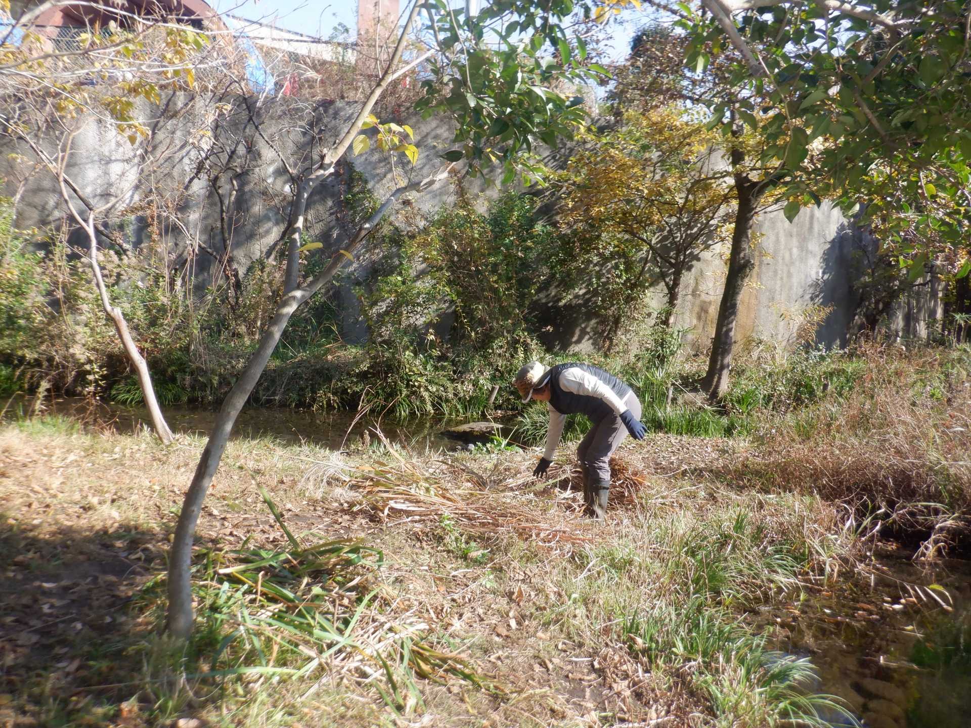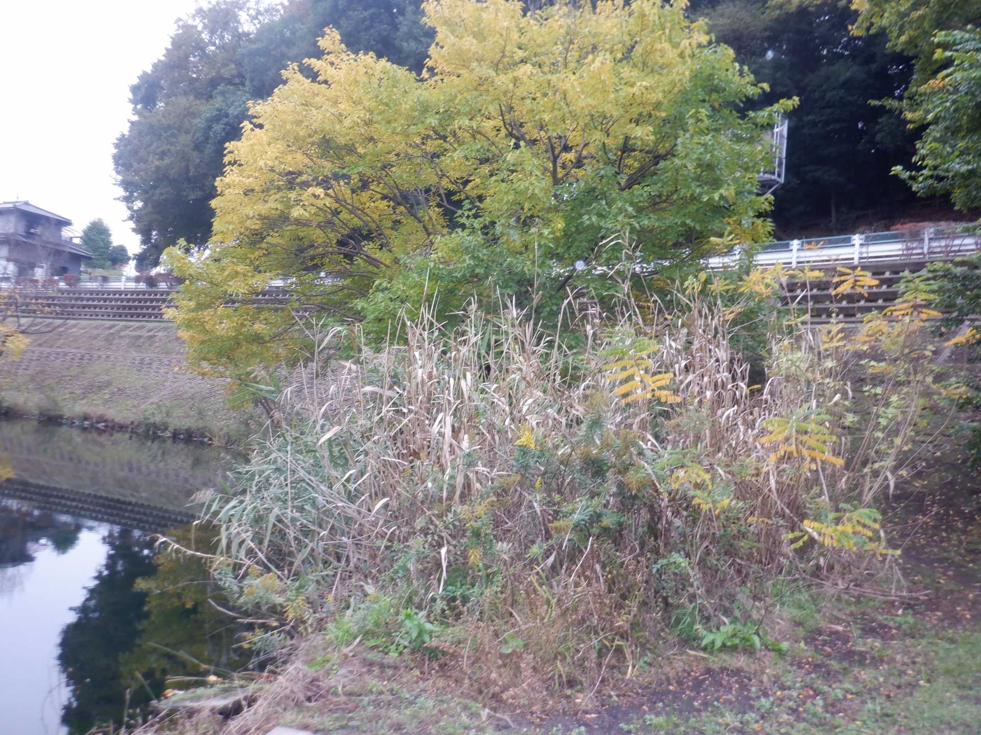 今日の作業は、水路対岸にあるクロガネモチ6本とエノキの伐採です。エノキは問