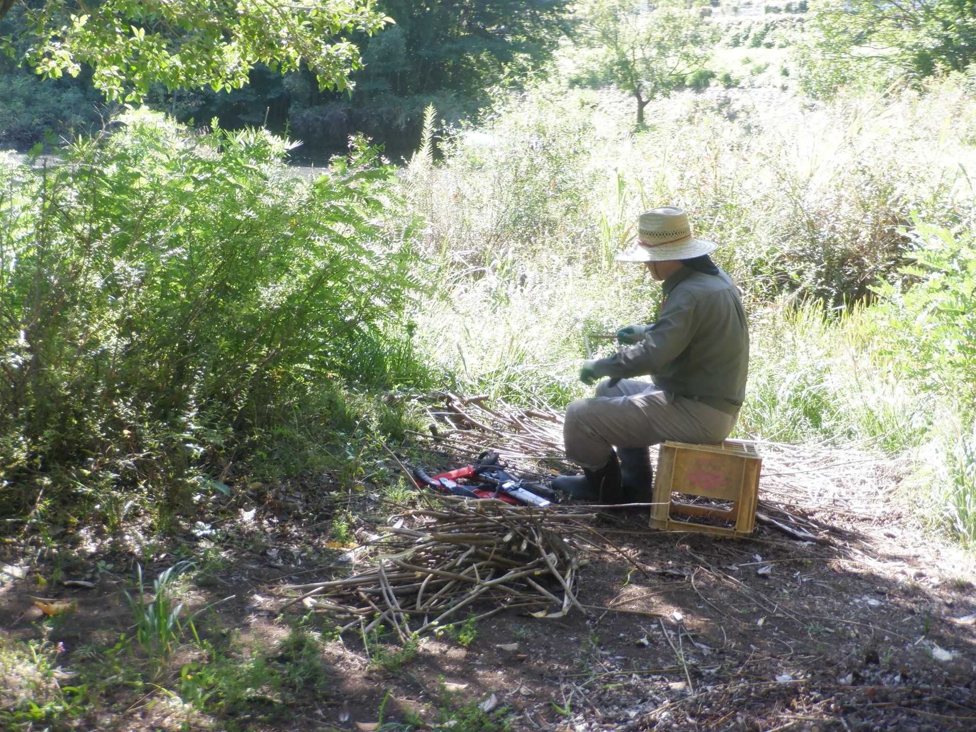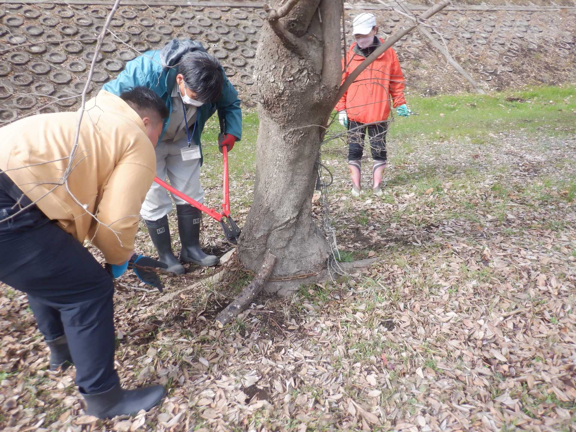 た。その後、太い幹を玉切りし、細枝を切りそろえたところで作業終了。枝の搬出は
