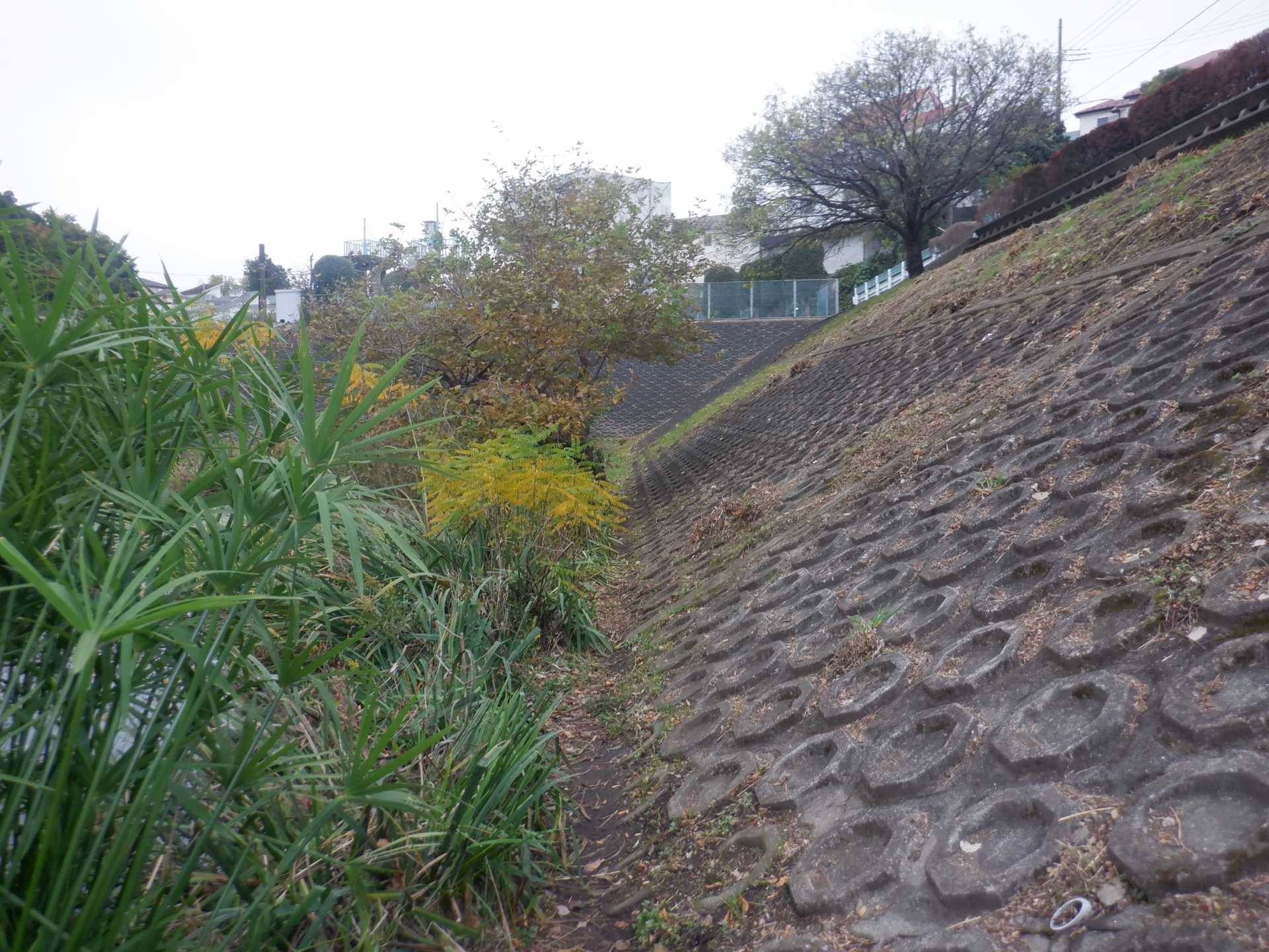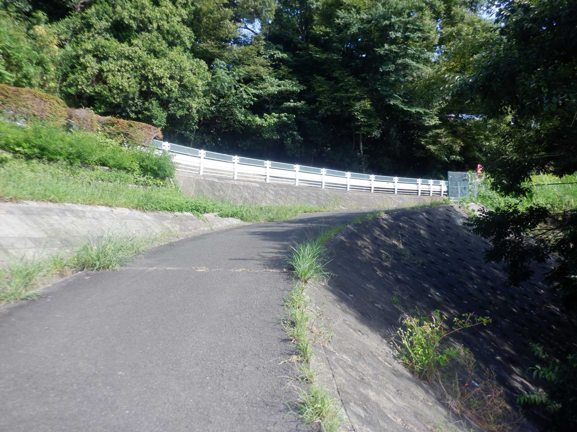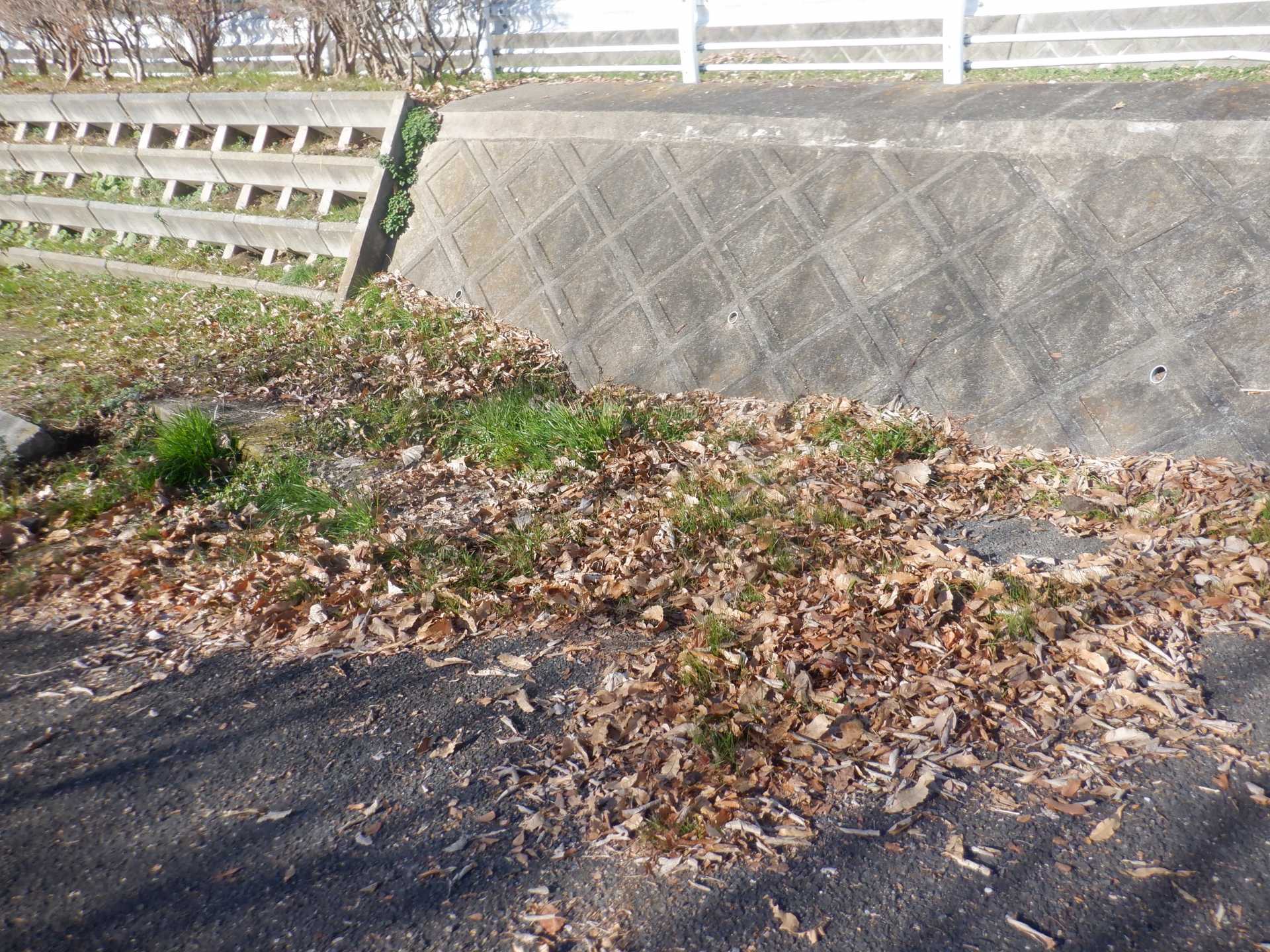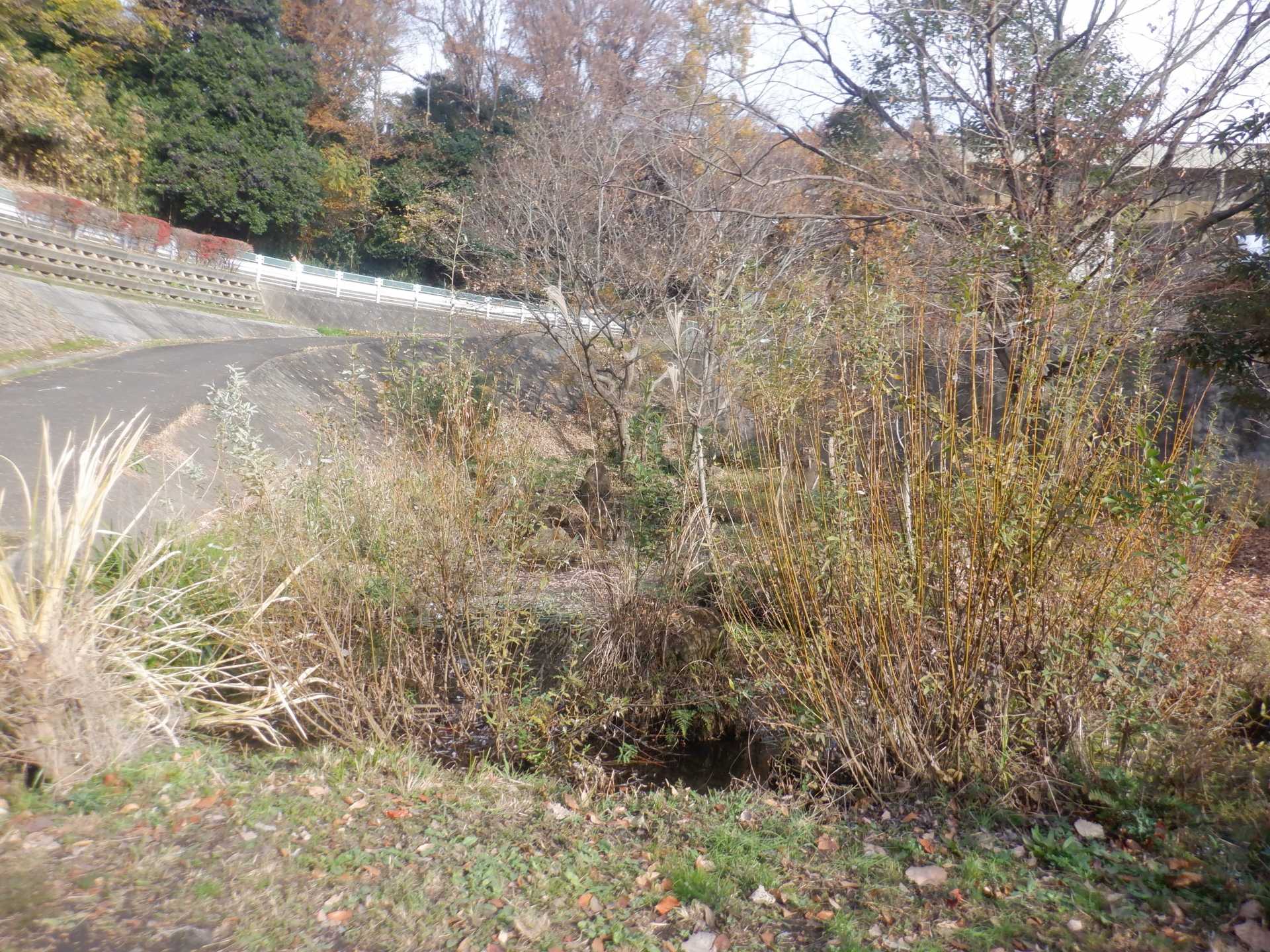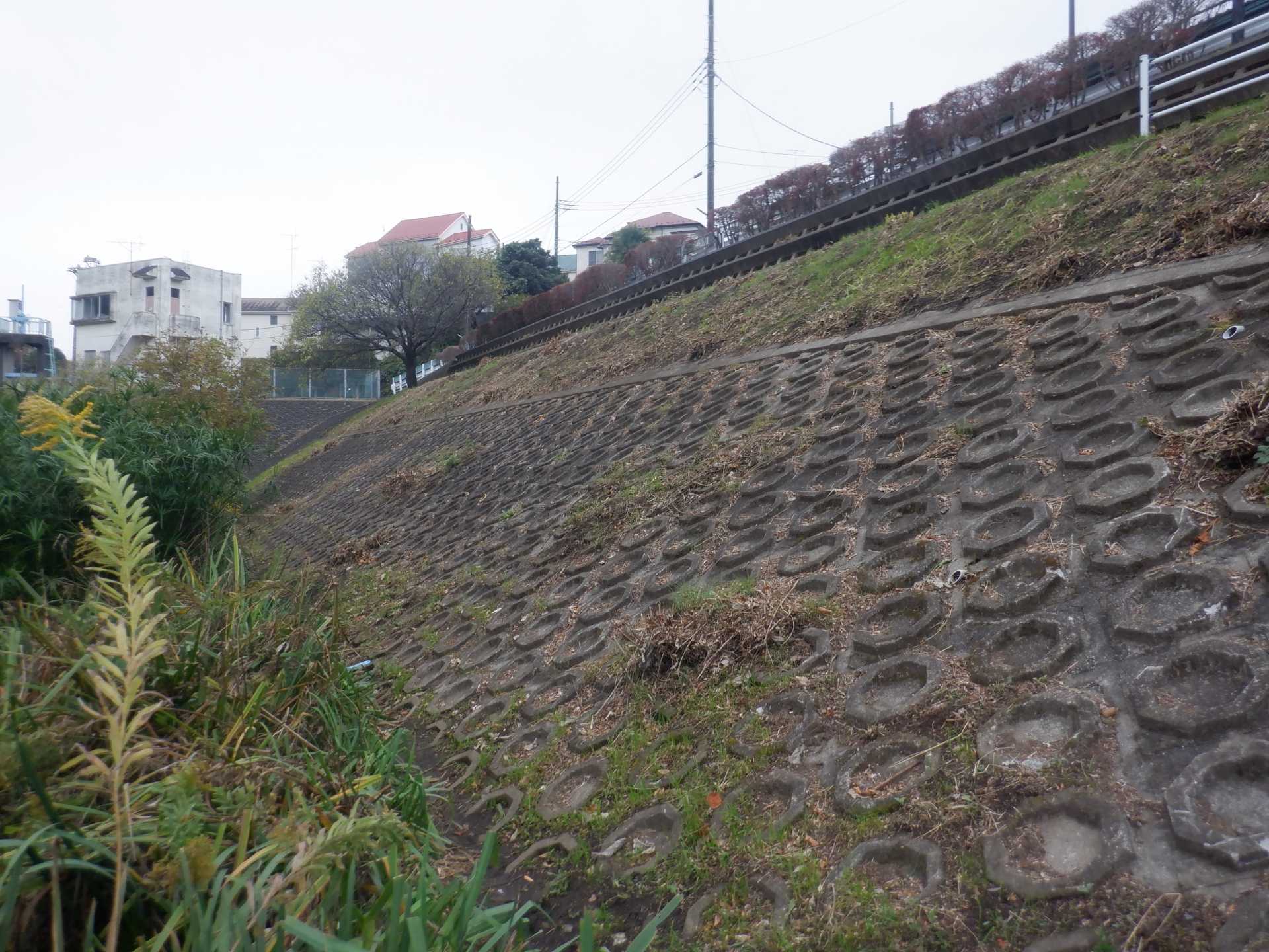 題なく倒せましたが、モチは遊水地の壁に倒れかかり、びくともしません。擁壁上で