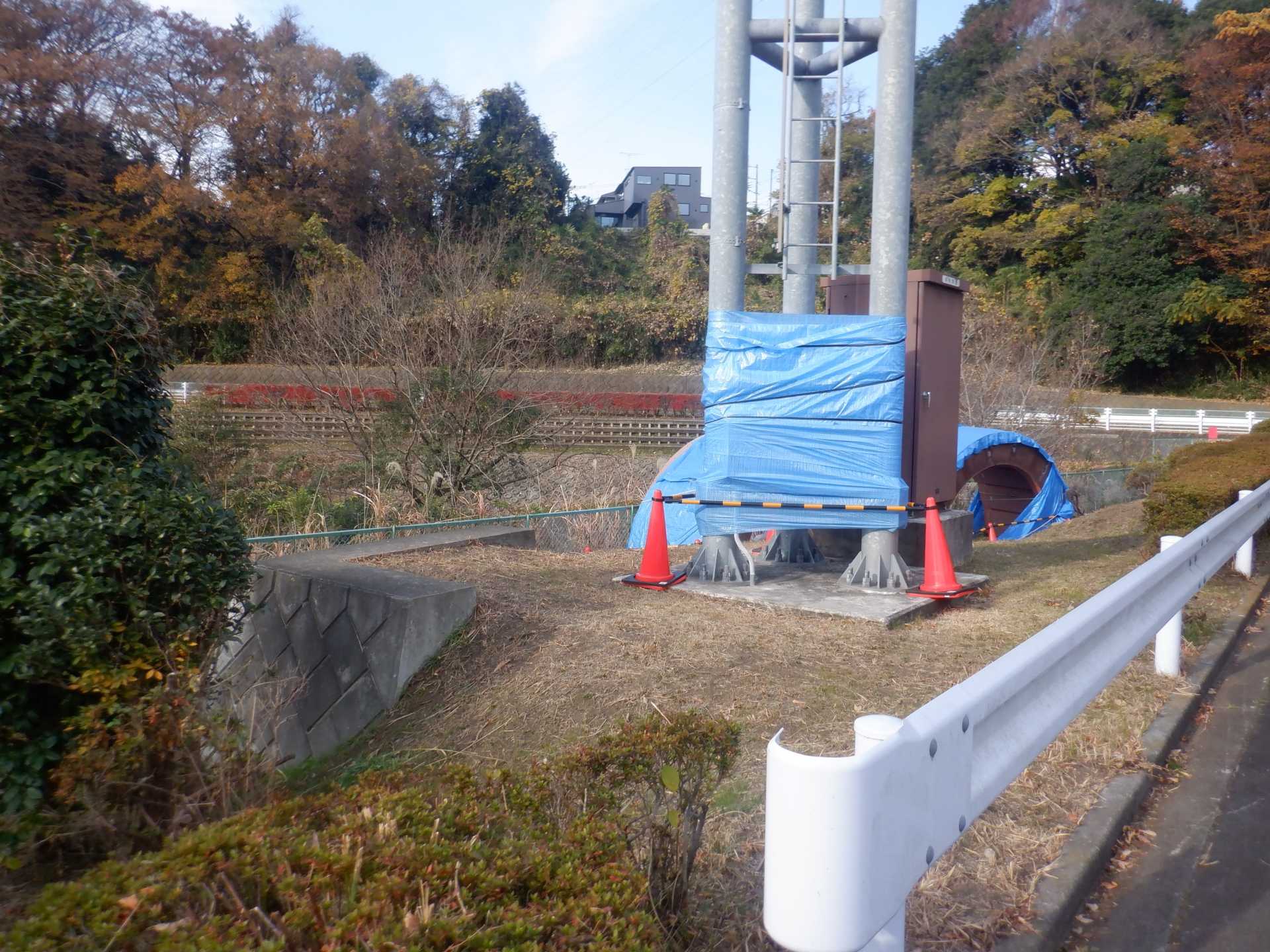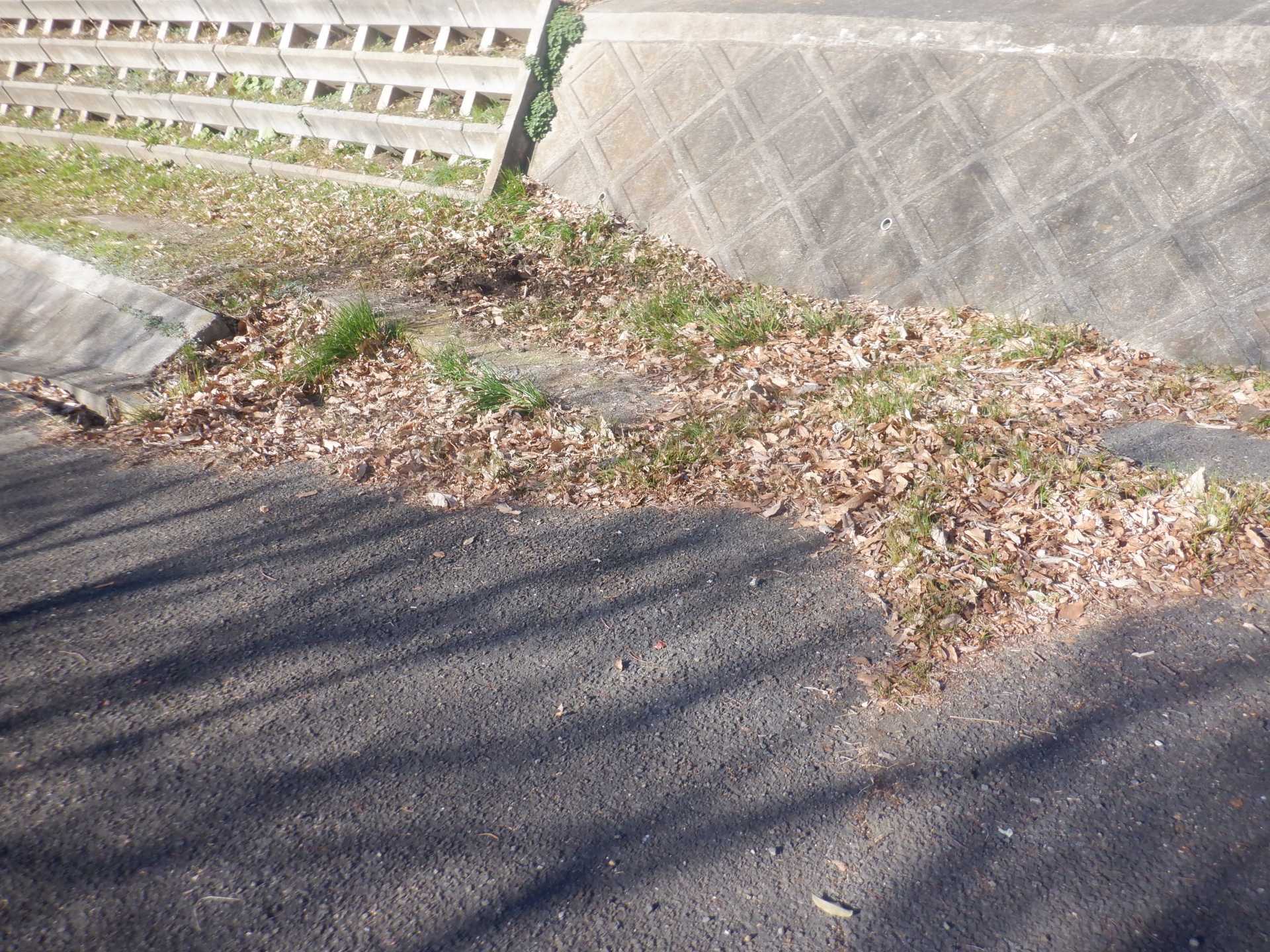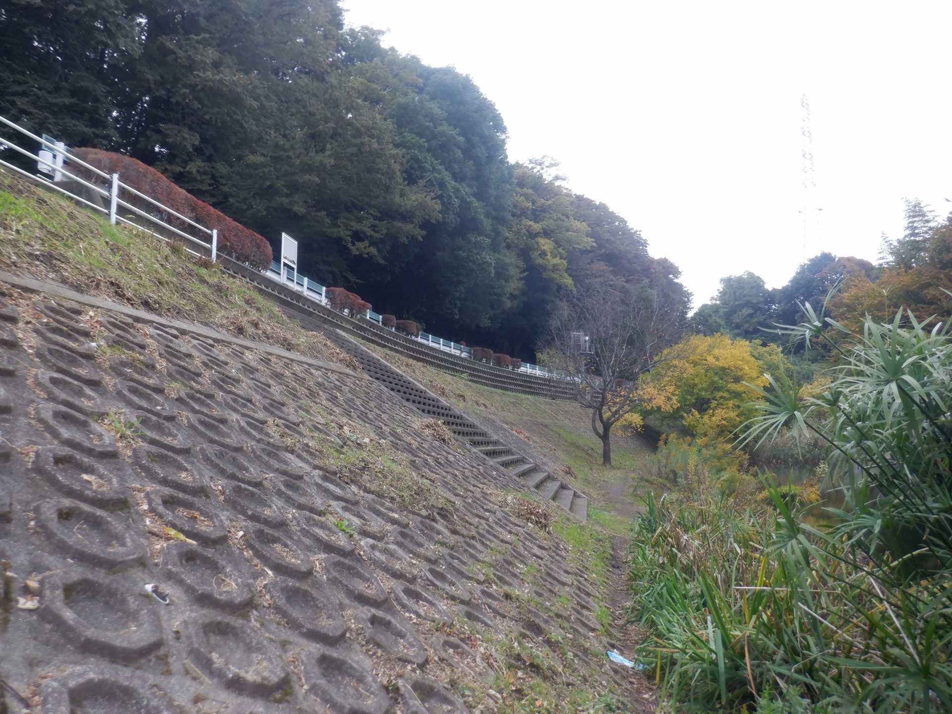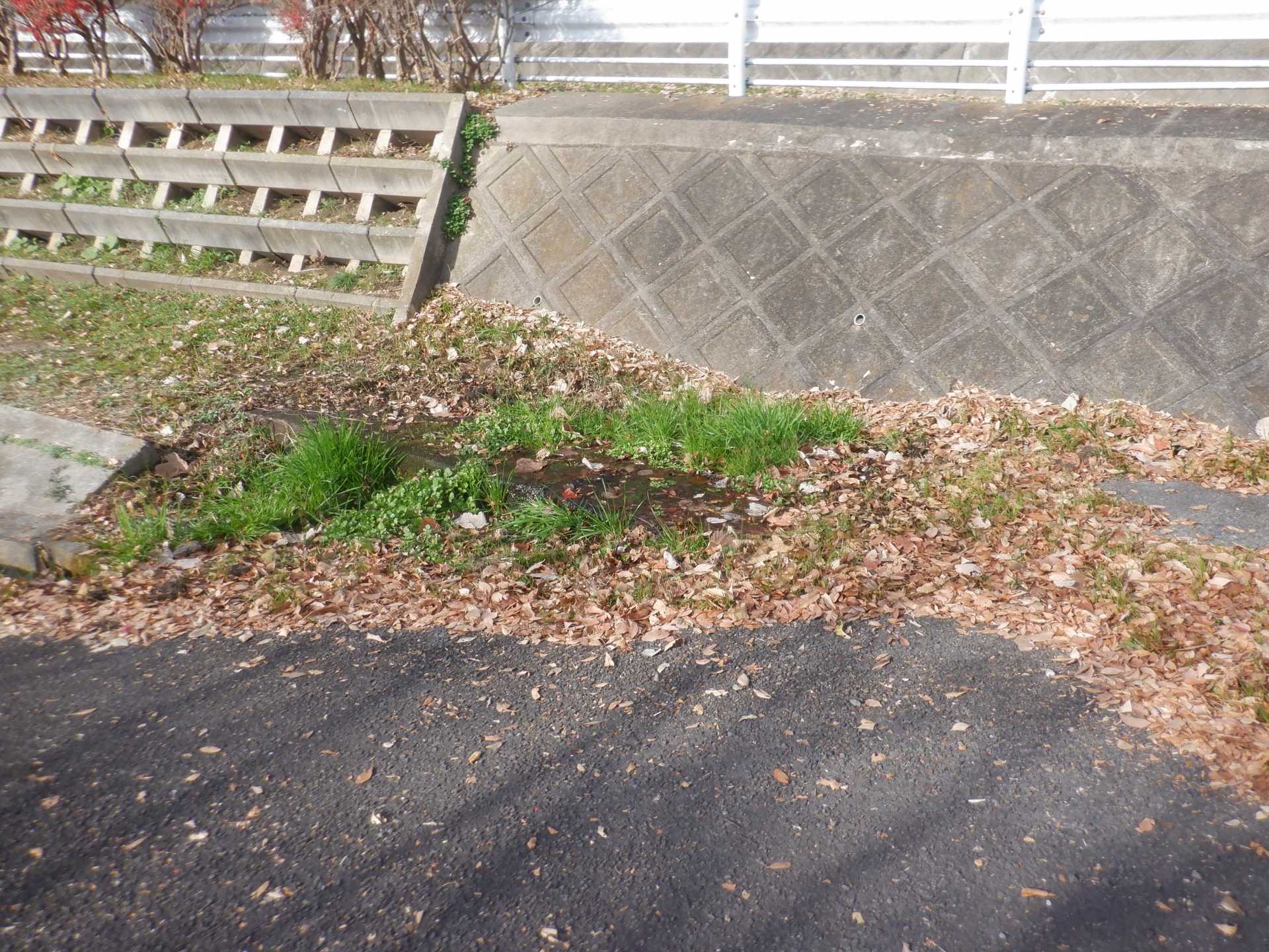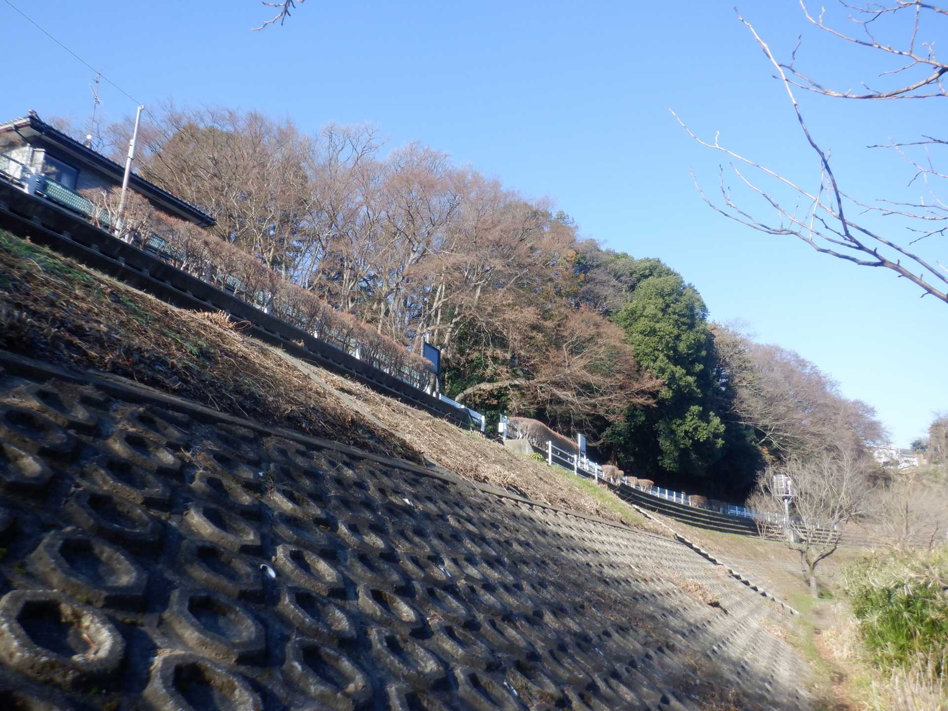 題なく倒せましたが、モチは遊水地の壁に倒れかかり、びくともしません。擁壁上で