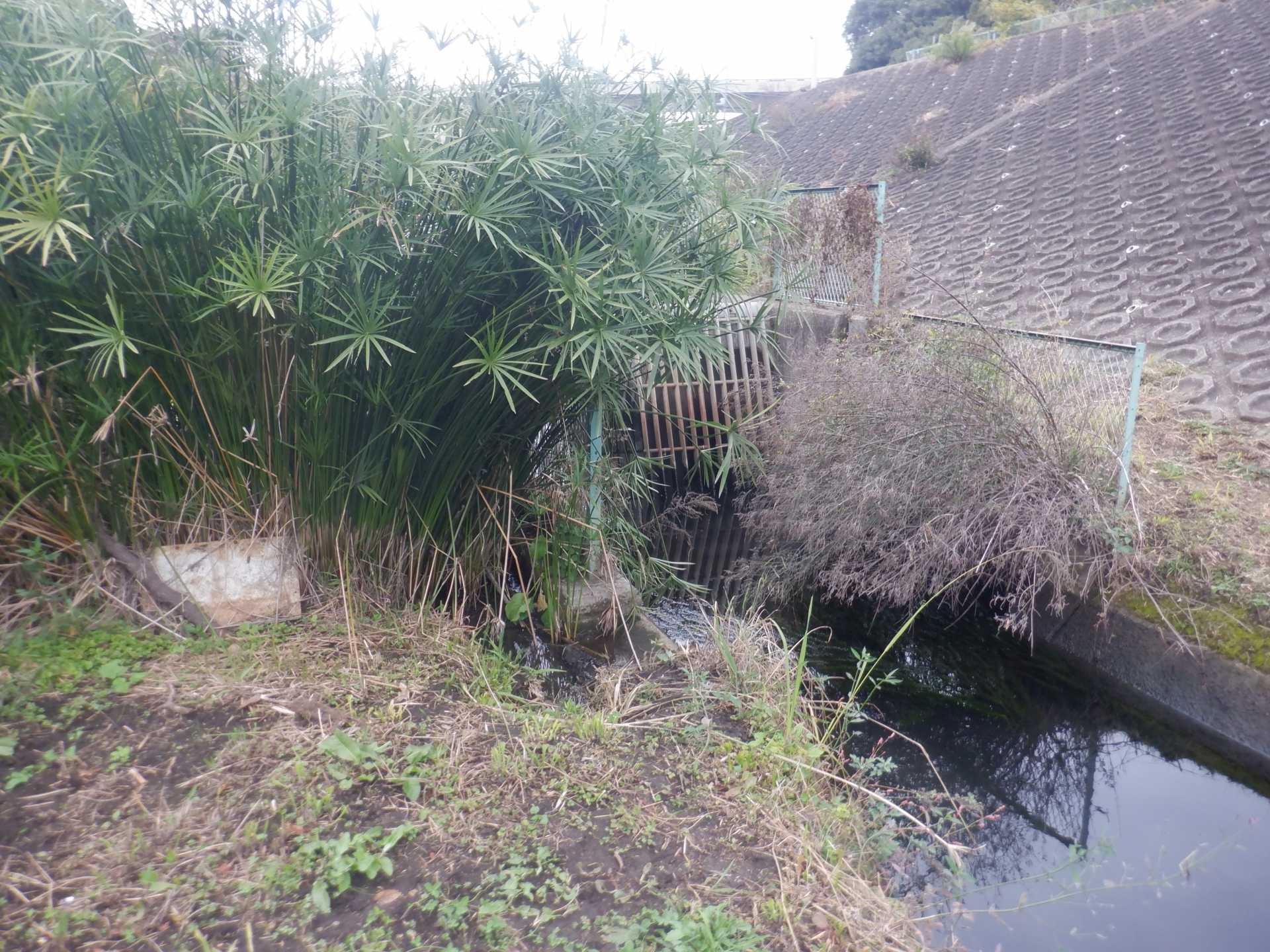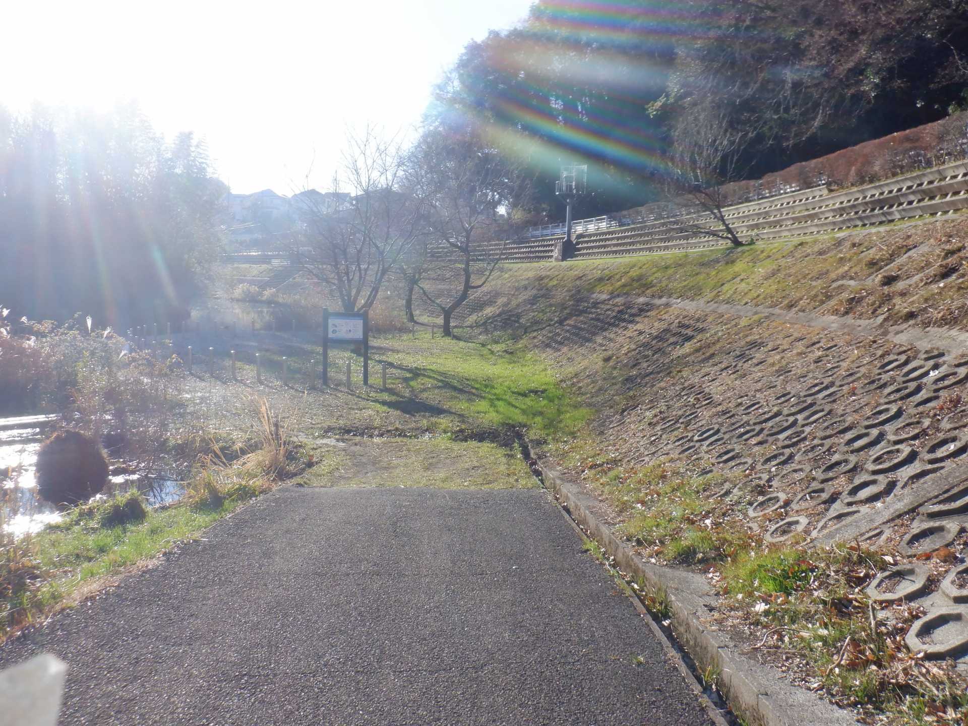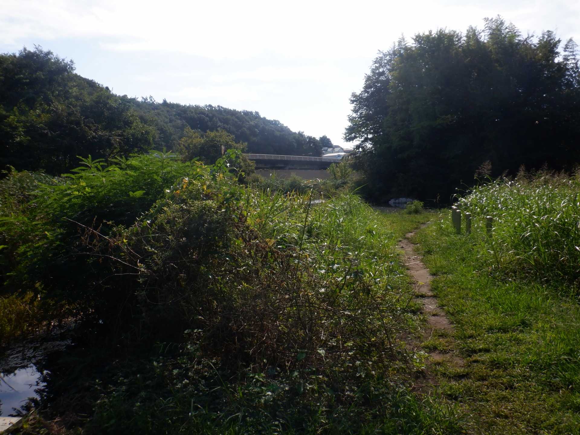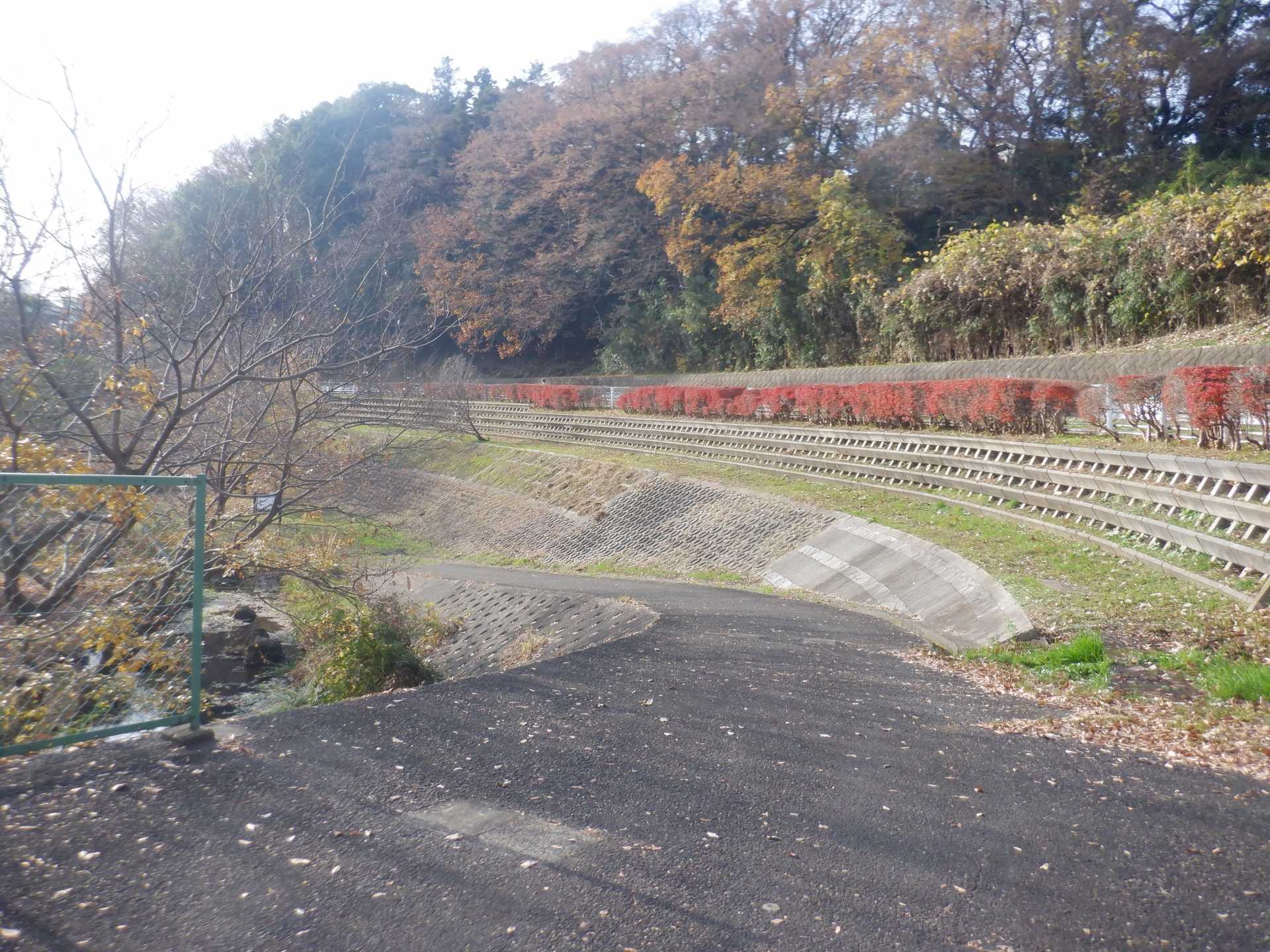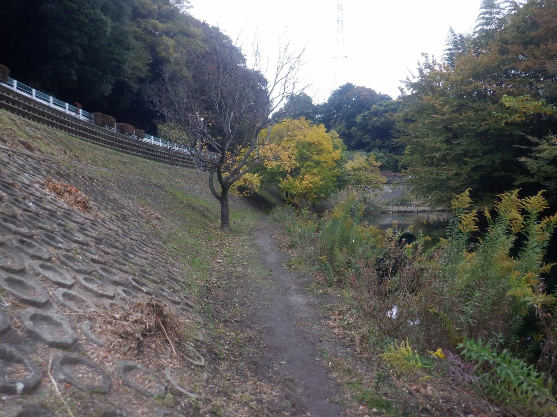 題なく倒せましたが、モチは遊水地の壁に倒れかかり、びくともしません。擁壁上で