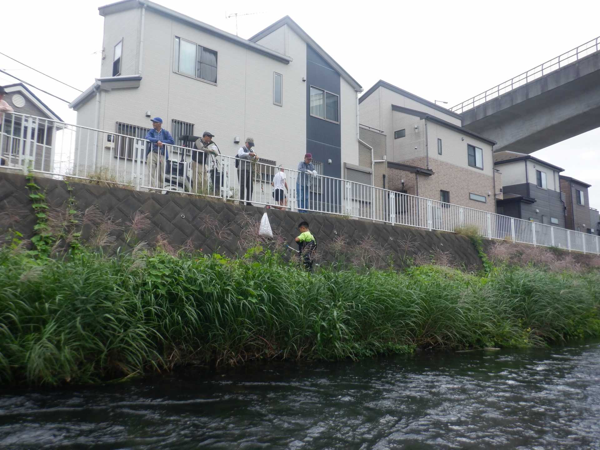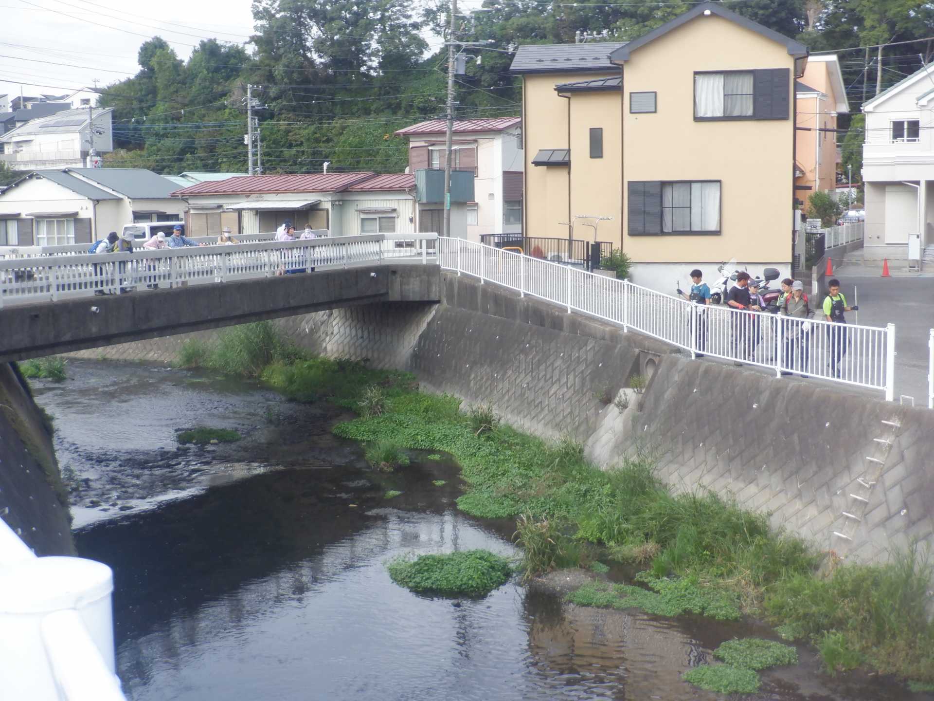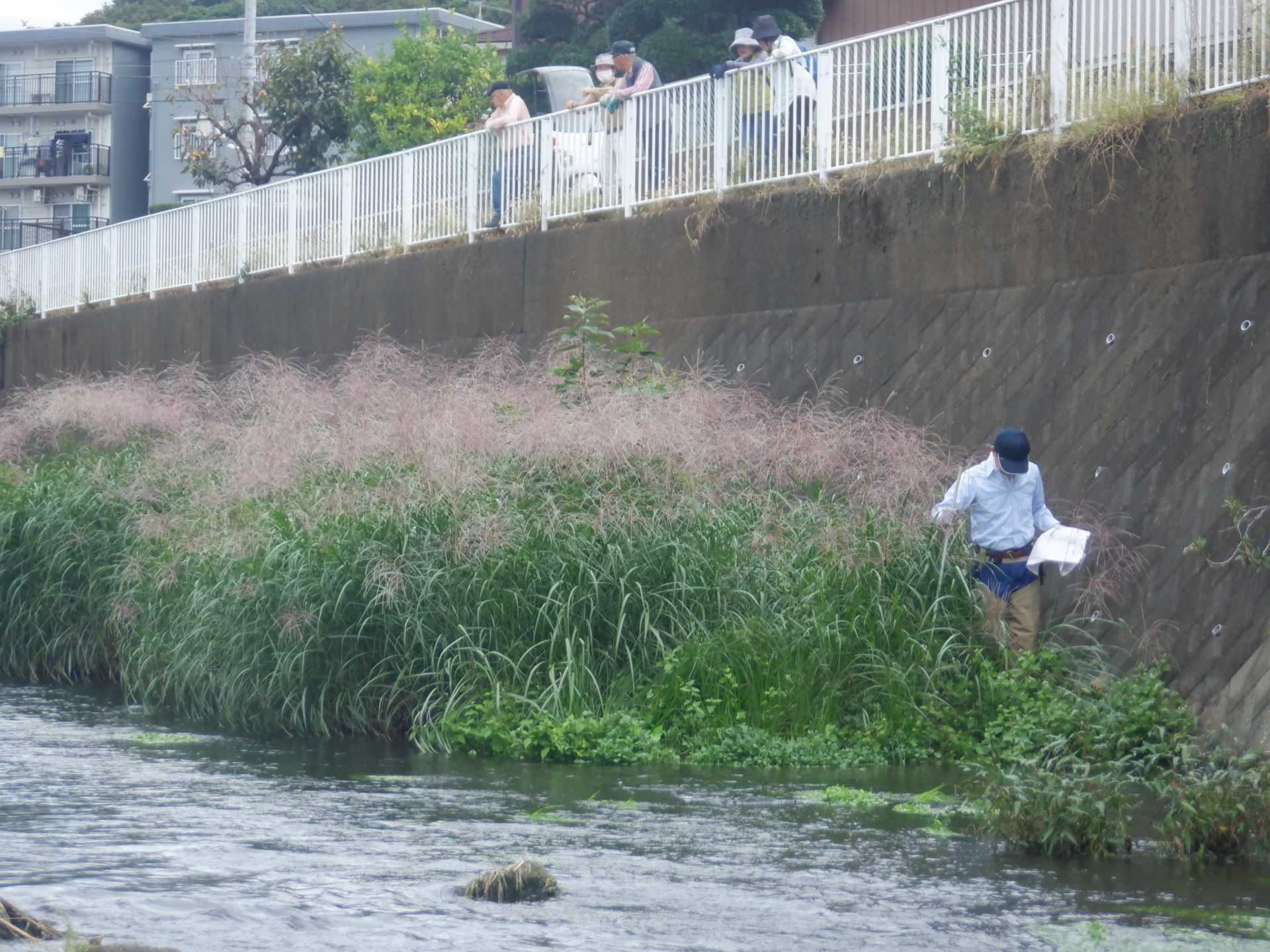 流れは澄んでいいて、川岸の草むらは結構茂っております。草むらのアレチウリにはスズメバチが来ており、岸の上からそこに入らないように注意しました。